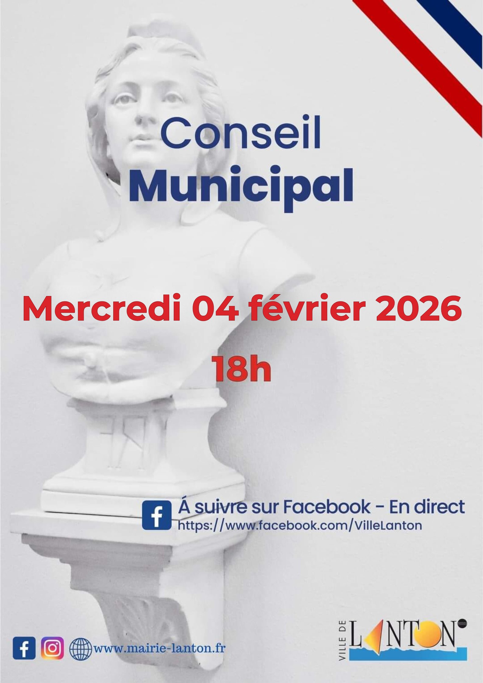 Le prochain Conseil municipal de la Ville de Lanton se tiendra le mercredi 04 février 2026 en salle du Conseil Municipal, 2 route de Blagon (au Centre d’Animation de Lanton), dès 18h.