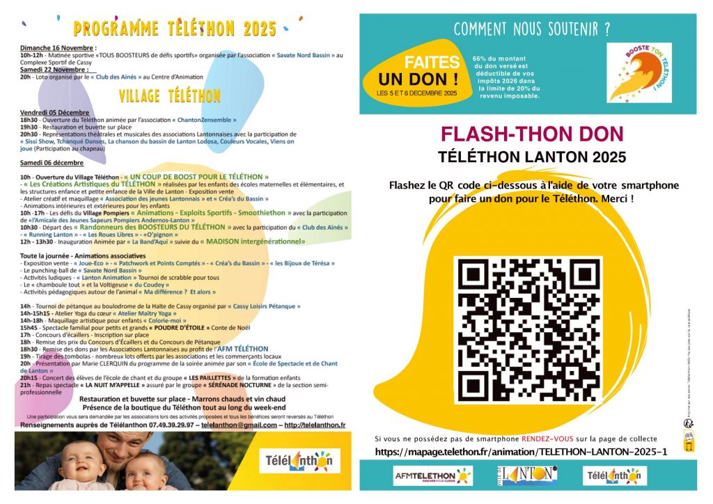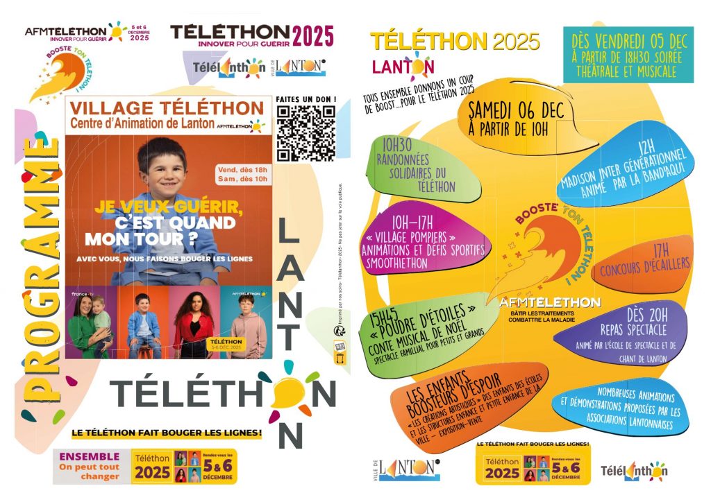 Le Village du Téléthon s’installe au Centre d’Animation de Lanton du vendredi 5 décembre à 18h30 au samedi 6 décembre. Au programme : de nombreuses animations et démonstrations proposées par les associations lantonnaises !